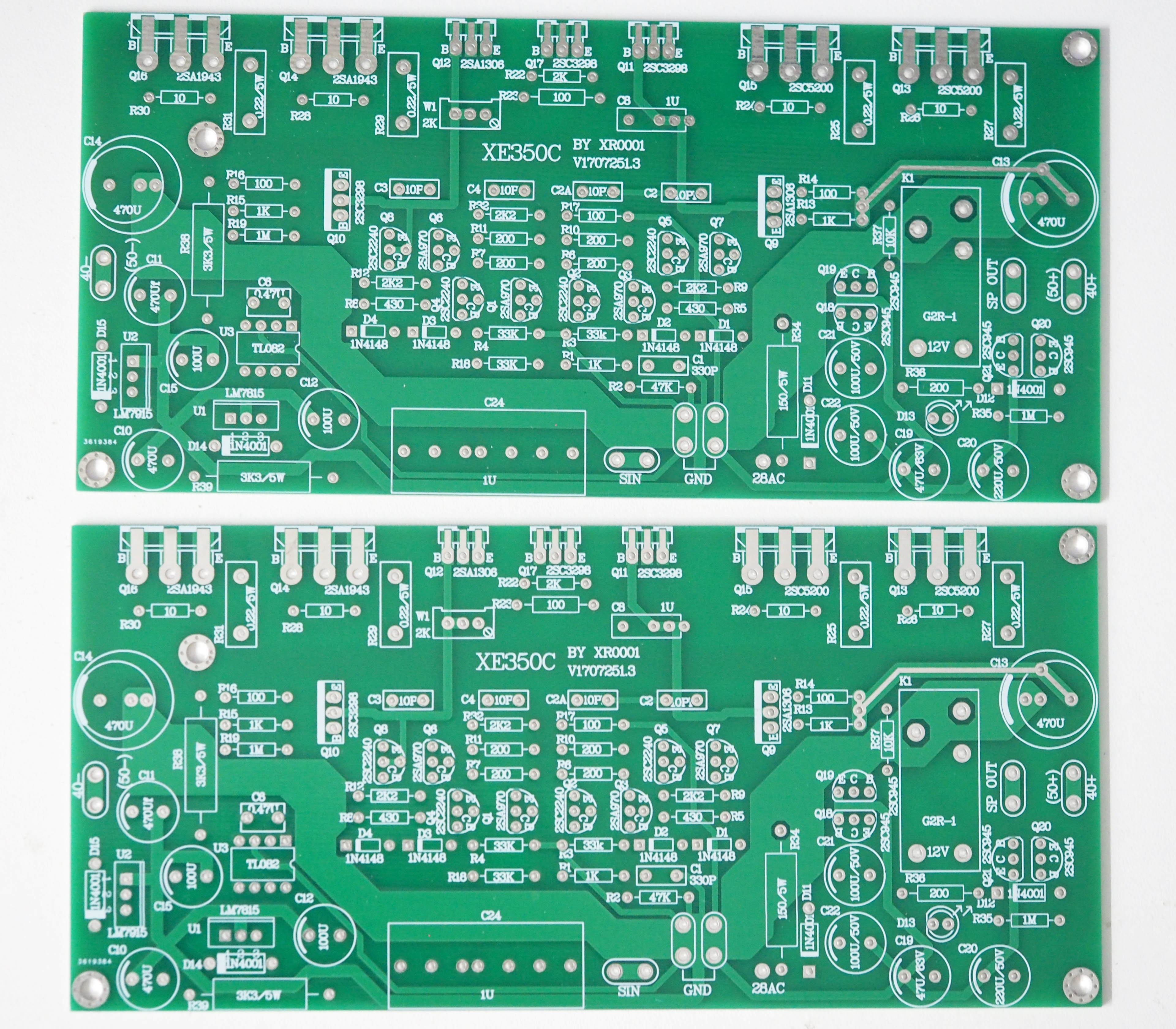 This is one set of two PCBs that can form a stereo power amplifier.