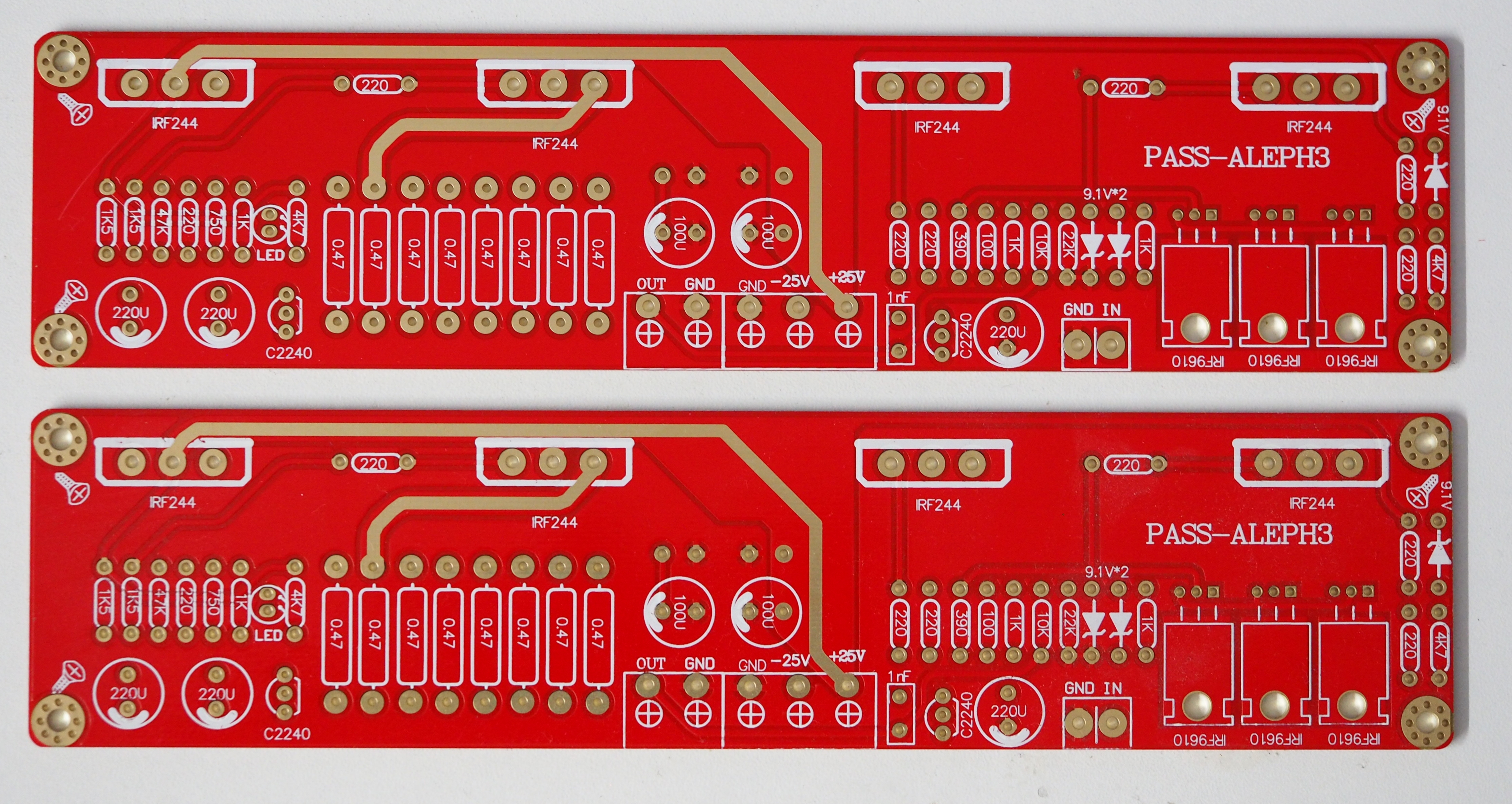 This is two sets of boards. This is the bare PCB of a pure class A MOSFET amplifier, output power 30W at 8 ohms loading. The design takes minimalist approach, single-ended configuration for warm and musical sound. This is a single channel amplifier PCB. Two PCBs are needed to form a stereo amplifier. PCB dimension : 214mm x 51mm. PCB thickness : 2mm, 2 oz ( 75um thickness copper) deposition which is FOUR times normal process of copper thickness.