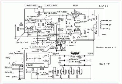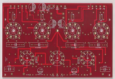 a stereo EL34 push-pull tube amplifier. The driver tube is 12AU7 preceded by 12AX7 at the input. The schematic is as shown in the picture below. This is a bare PCB of PCB dimension : 200mm x 135mm