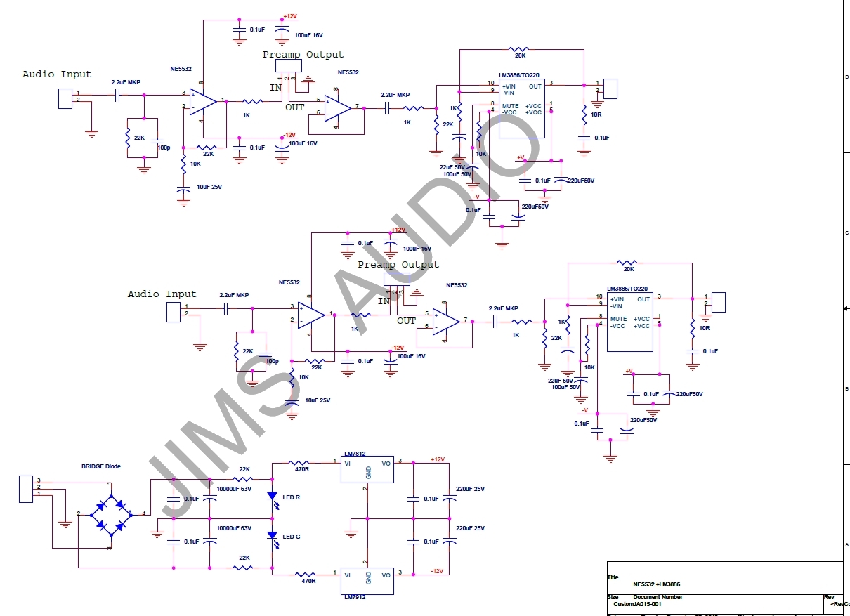 This is the PCB of a stereo power amplifier using NS's renowned LM3886 power amplifier chip. The circuit contains a preamplifier stage. Either popular NE5532 or other high performance opamps can be used.