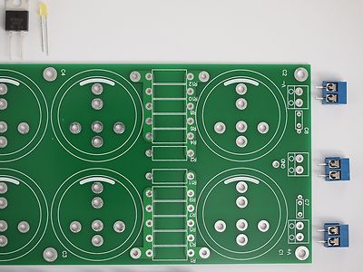 On list is a partial kit of a heavy duty DC power supply, design for pure class A amplifier or other high power amplifiers. The design uses CRC filtering configuration for high speed and good DC regulation. The PCB uses four discrete diodes for rectification, and four pieces of very good sound MUR860 are to be installed with this kit. The board can also be adapted for CLC filtering by replacing the serial resistor with dc choke.